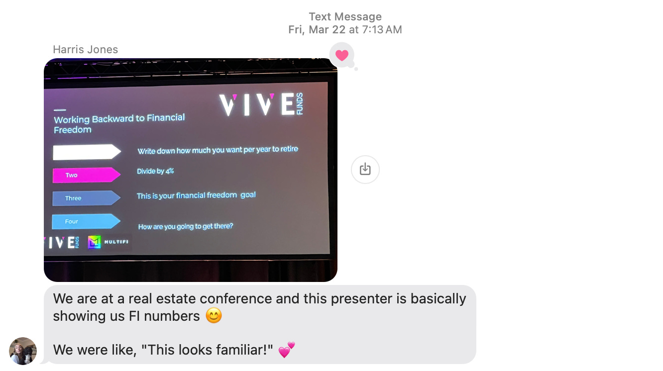 saw FI numbers at a real estate conference she attended!